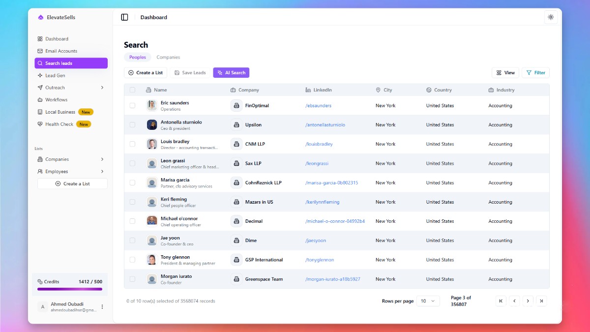 Using ElevateSells data enrichment features, he pulled verified emails, LinkedIn profiles, and company details. Then he segmented his list by company size, industry, and buying intent.